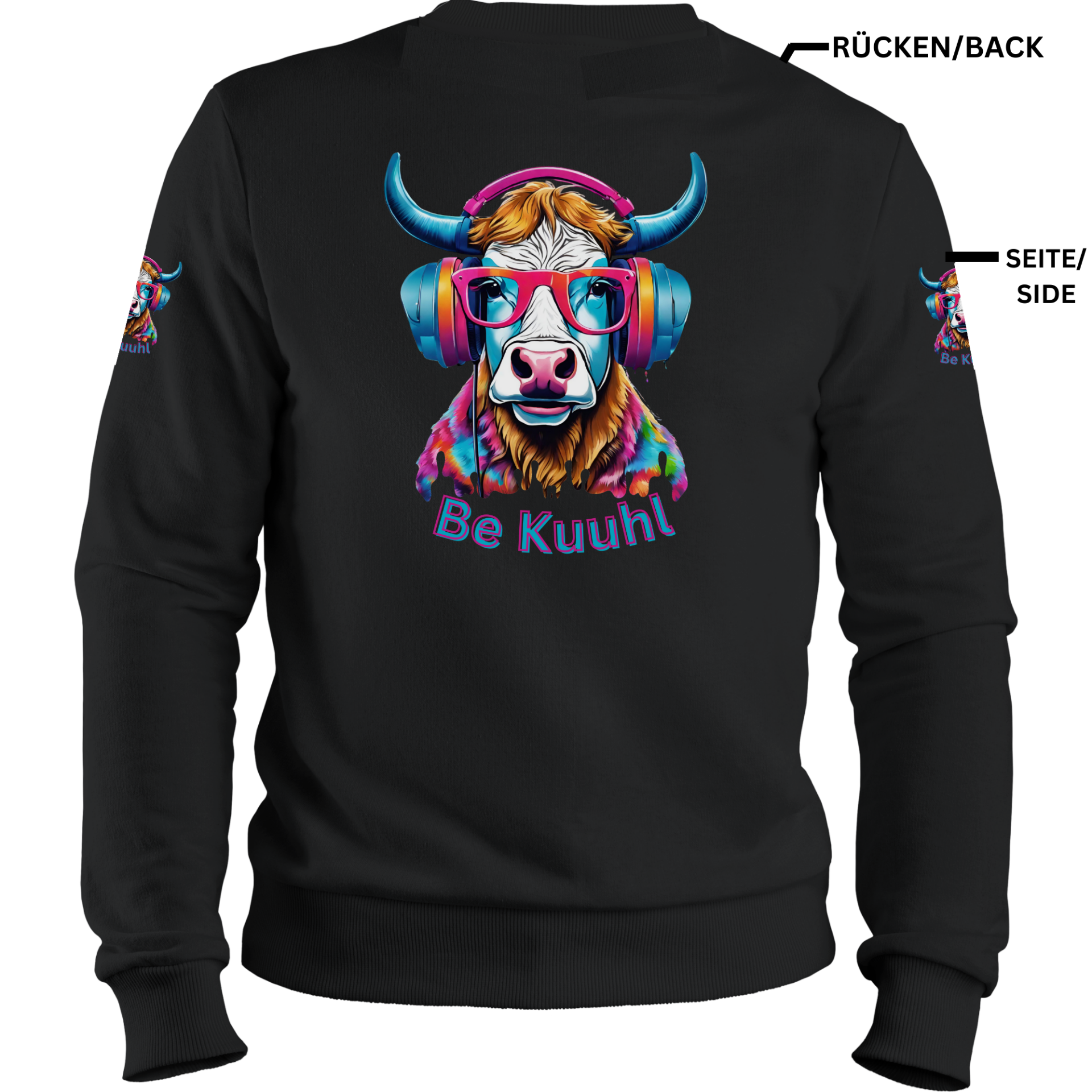 Crew Neck Sweatshirt Unisex Color "Be Kuuhl" Willi mit Kopfhörer / 4 Seitiger Druck - DJ Jon Color