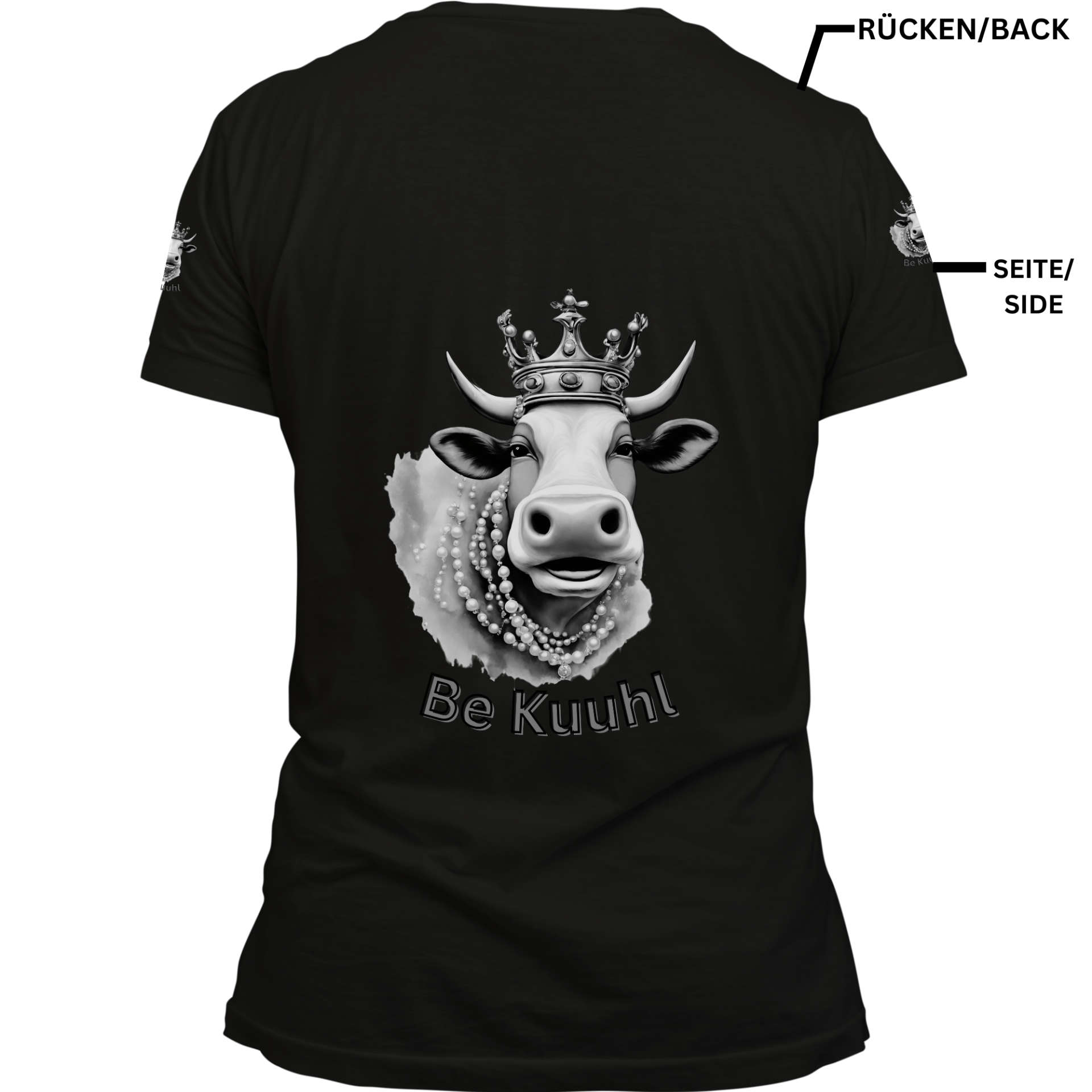 T-Shirt Unisex "Be Kuuhl" 4 Seitiger Druck - Königin Mutter White/Black