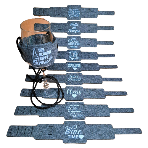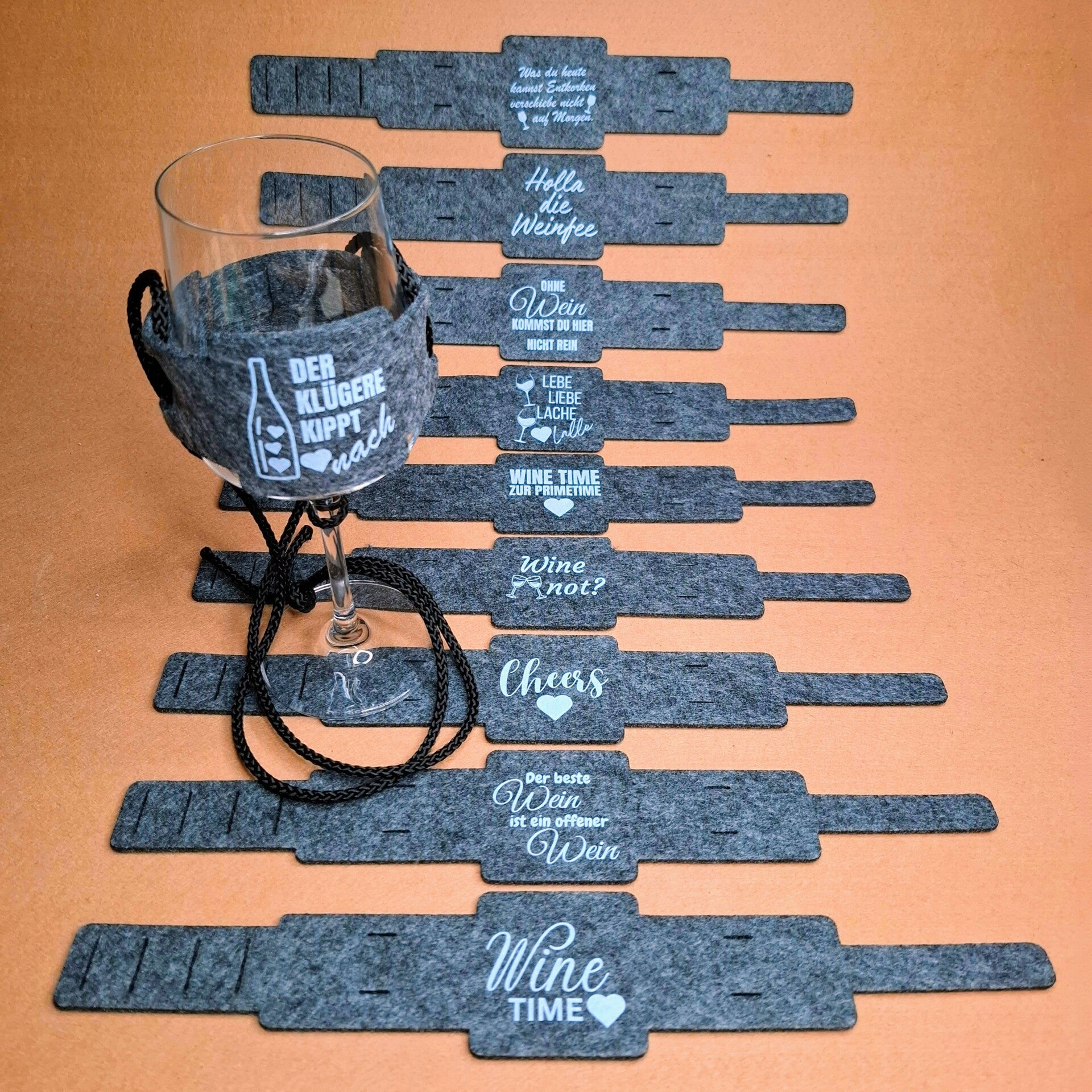 10 Weinglashalter DTF Weiß Bedruckt zum Umhängen in Grau | Filz | mit verschieden Weinsprüchen klar und deutlich