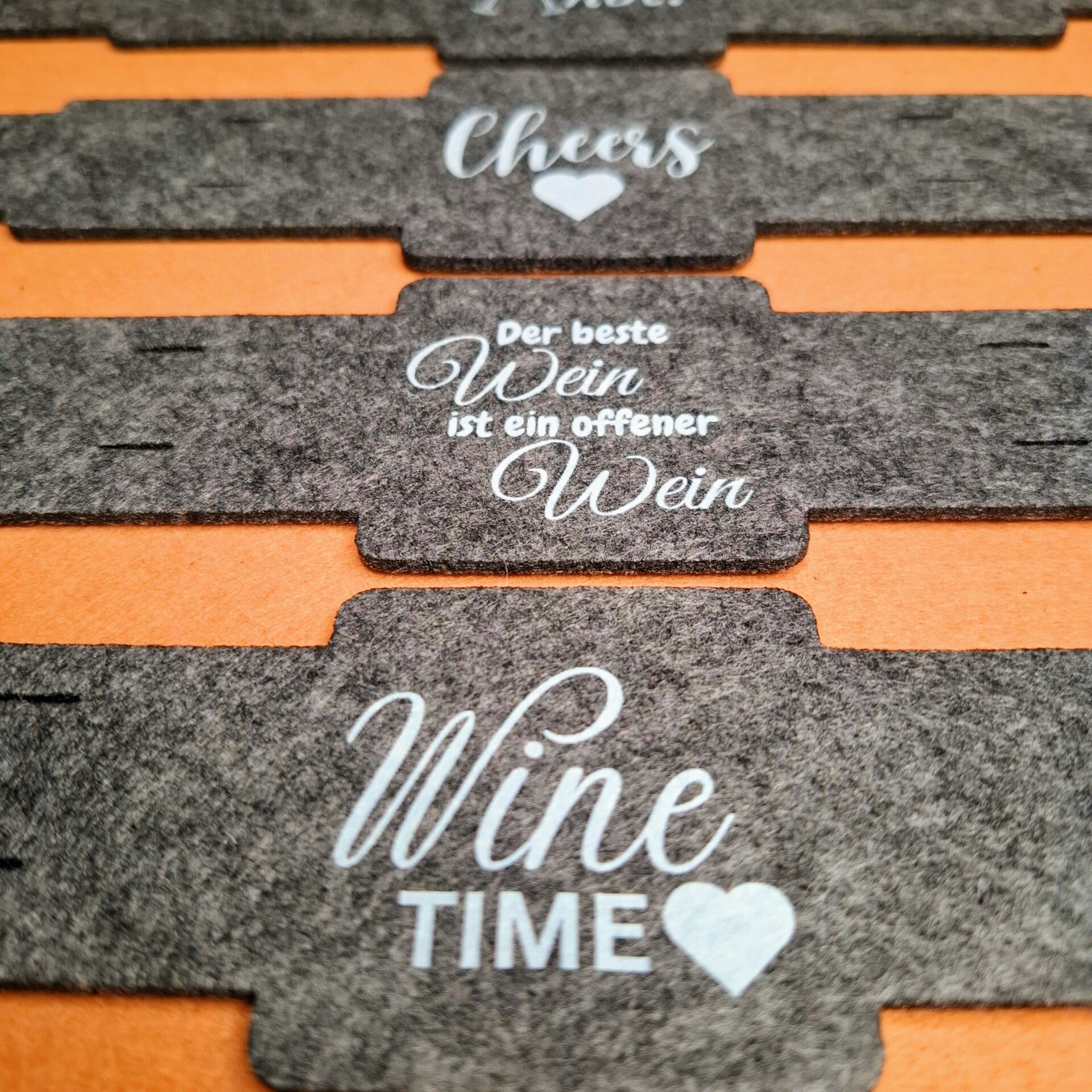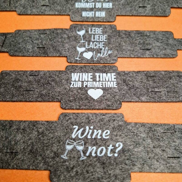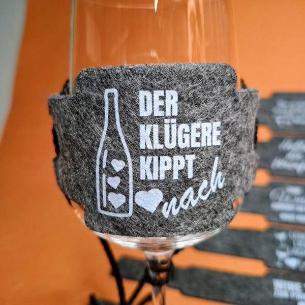1 Weinglashalter DTF Weiß Bedruckt zum Umhängen in Grau | Filz | mit aus wählbarem Weinspruch klar und deutlich