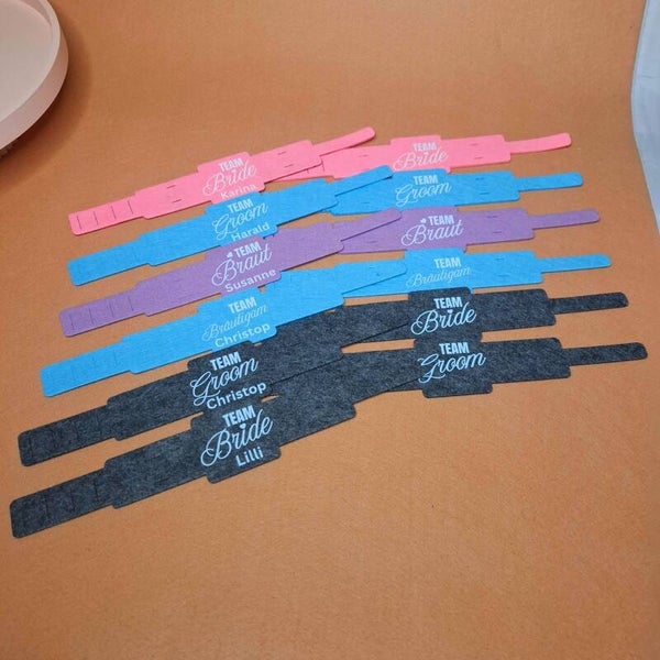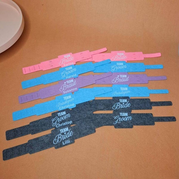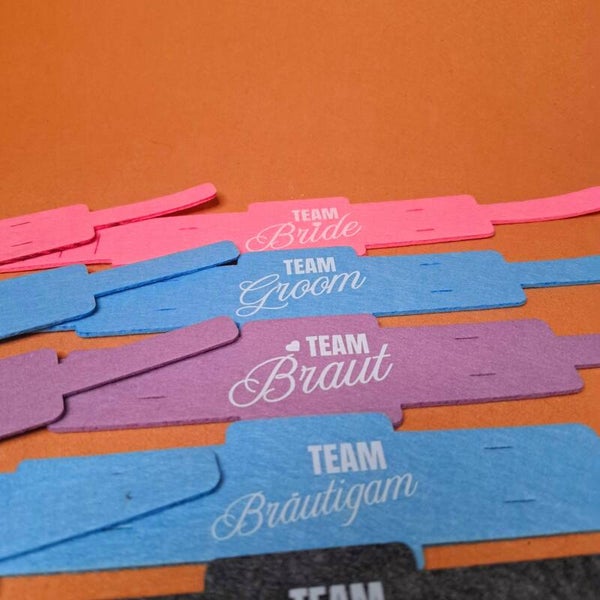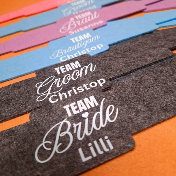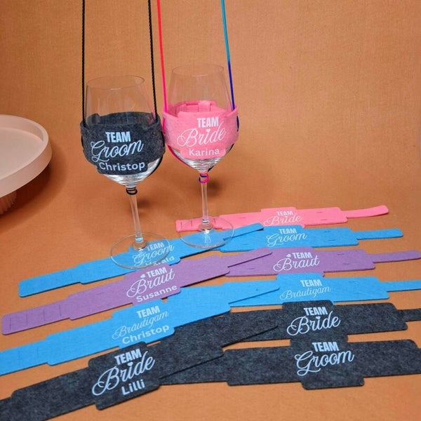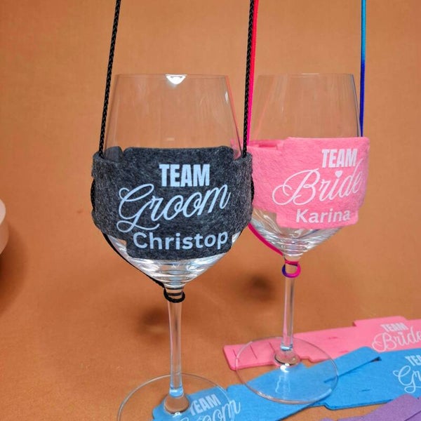 10 Weinglashalter zum Umhängen | DTF Gedruckte Glas Halter | Filz | Team Groom - Team Braut - Team Bräutigam - Team Bride - mit oder ohne Personalisierung