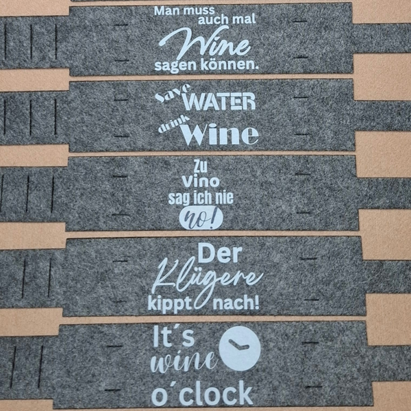 Jede Weinglashalterung wird mit einem originellen Spruch versehen.