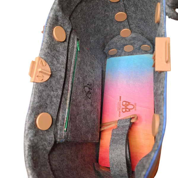 Der textile Filz besteht aus recycelbarem PA und bildet die stabile, graue/anthrazitfarbene Basis des Shoppers. In Kombination mit den farblich wählbaren Accessoires, Griffen und dem praktischen Schnappverschluss entsteht ein individuell gestaltbares Designerstück – schlicht und zeitlos, aber mit auffälligen Akzenten.