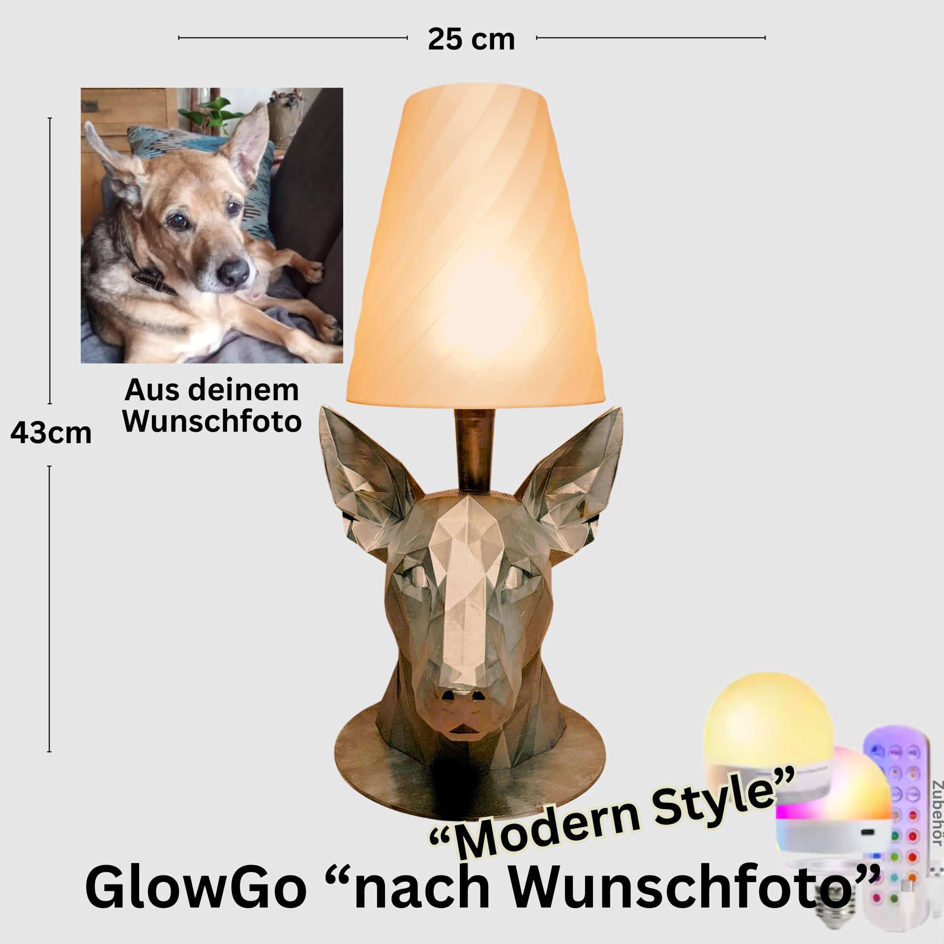 Verwandeln Sie ein einfaches Foto in ein einzigartiges Kunstwerk, das Ihren Raum zum Leuchten bringt. Die GlowGo Tischlampe ist mehr als nur Beleuchtung – sie ist ein personalisiertes Statement. Aus Ihrem persönlichen Wunschbild wird eine detaillierte, stilvolle Büste gefertigt, die in faszinierendem Licht erstrahlt.