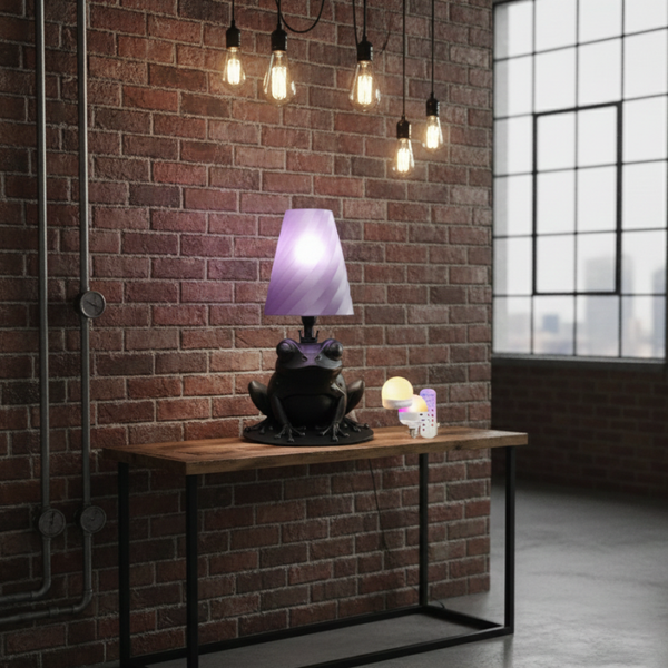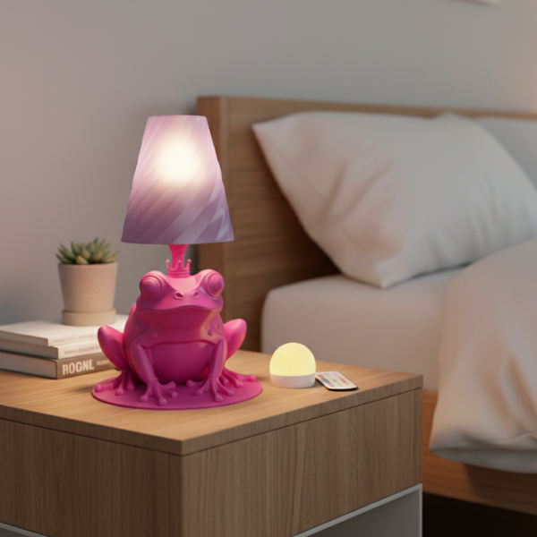 Design: Ein detailreich gestalteter Frosch, gefertigt im 3D-Druck-Verfahren, dient als stabiler Lampenfuß. Er ist in Schwarz, Weiß, Magenta, Pink, Rosa oder Weiß erhältlich und besitzt eine feine, subtile Struktur, die den Charakter des 3D-Drucks unterstreicht. Der klassische Lampenschirm mit seiner leicht geschwungenen Form und sanften Farbe sorgt für ein warmes, stimmungsvolles Licht – ideal für Nachttisch, Beistelltisch oder Regal. Den Lampenschirm gibt es in 4 Farben.