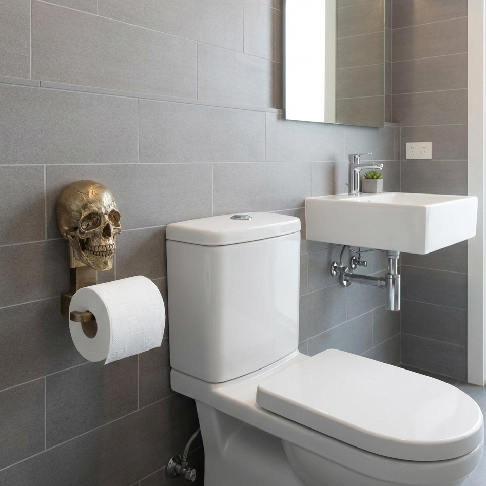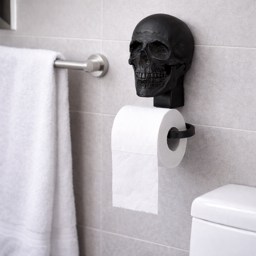 Verleihen Sie Ihrem Badezimmer oder Gäste-WC eine außergewöhnliche und markante Note. Dieser detailgetreue Toilettenpapierhalter in Totenkopf-Optik ist nicht nur ein praktisches Utensil, sondern ein echtes Design-Statement für Liebhaber des Besonderen.